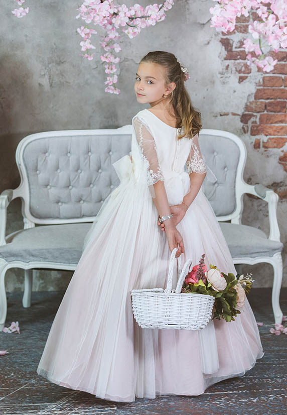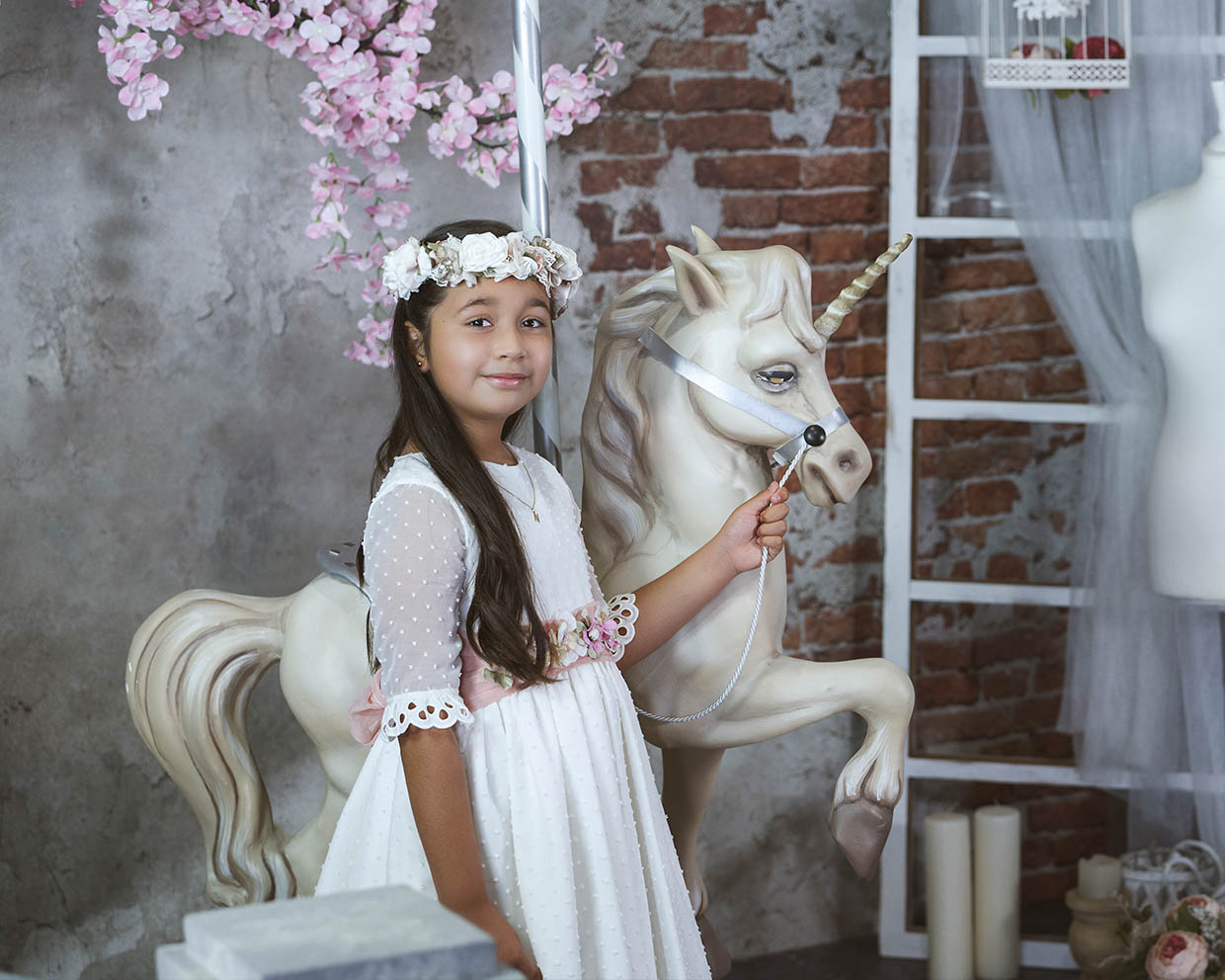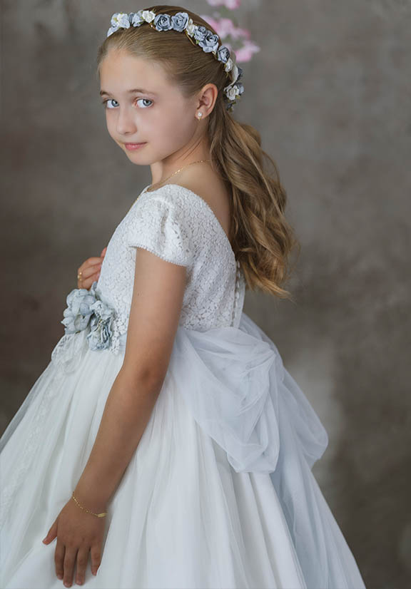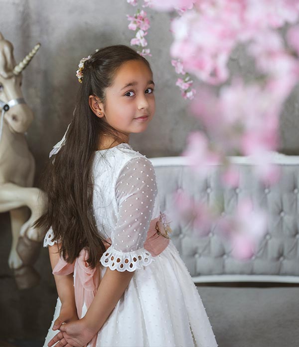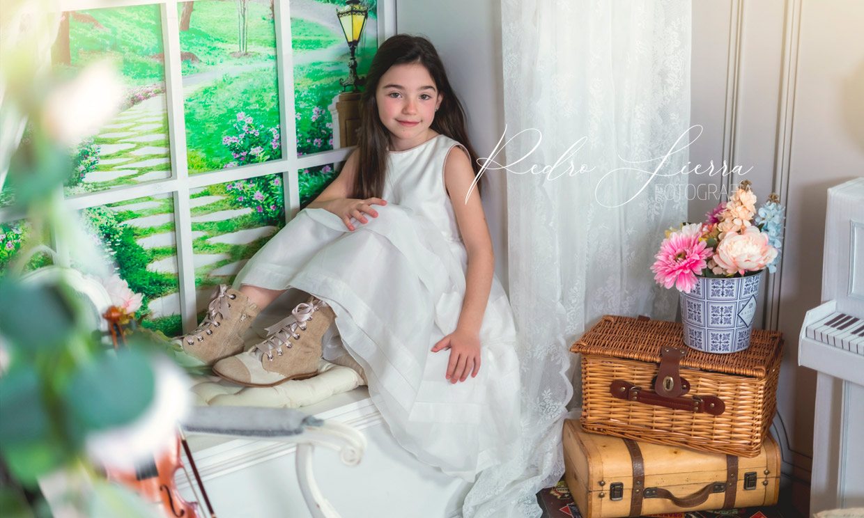 Trabajo dos estilos de retoque fotográfico de comuniosnes: uno más natural y directo, en el que el escenario y el acting del niño/a no es tan dirigido, y dejamos cierta libertad de movimiento. La iluminación y el retoque en este caso es luminoso y juego mucho con los desenfoques y los tonos neutros y suaves.